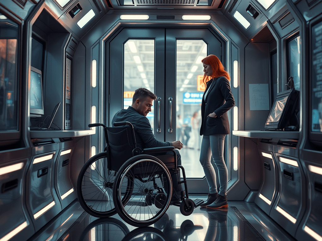 She was right. There was no chance of turning the wheelchair into the room. Derek crawls out of the wheelchair and into the low-rise bed.