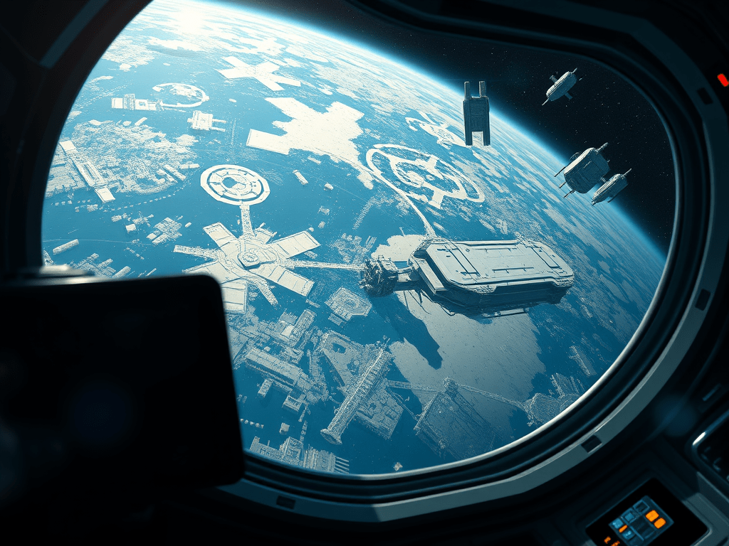 Hours pass, and the Earth now looms large in the viewport. Derek stares in fascination at the multitude of space habitats now visible in orbit. “Which one is the New Yorker habitat?”