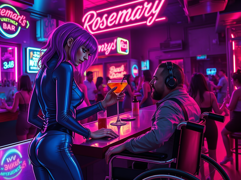 Rosemary’s proves to be everything he hoped for. It is crowded, but not so much that he can’t move around in his wheelchair. The latest music from Earth, a strange electric form, is playing. Strobe lighting is going back and forth. Now, what to order? It had been some time since his last one.