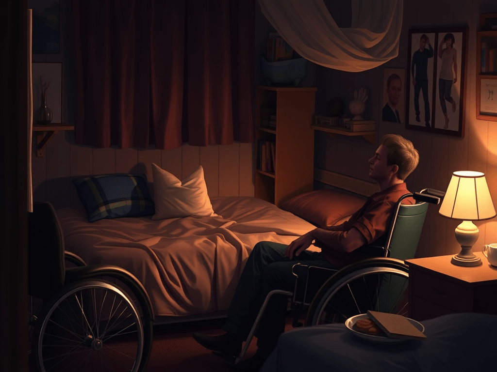 She was right. There was no chance of turning the wheelchair into the room. Derek crawls out of the wheelchair and into the low-rise bed.